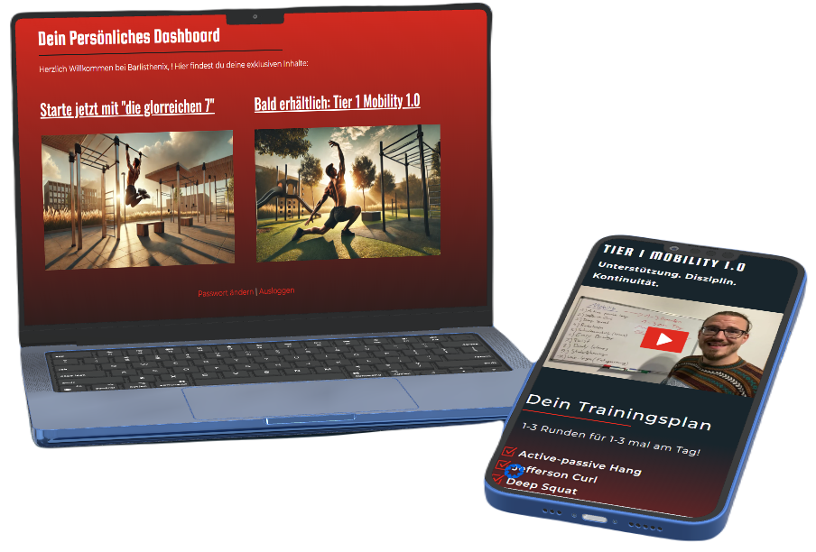 Mit unserem kostenlosen Videotraining "Die Glorreichen 7" kannst du endlich deine Unsicherheiten hinter dir lassen: Schluss mit der Scham über mangelnde Fitness und der Angst, etwas falsch zu machen. Du bekommst einen klaren Plan mit passenden Übungen, die deinem aktuellen Fitnesslevel entsprechen, sodass du sie sicher ausführen kannst – und dabei erste sichtbare Erfolge erzielst. Für mehr Selbstbewusstsein, Motivation und den perfekten Start in deine Calisthenics-Reise zum Tier-1-Athleten!“